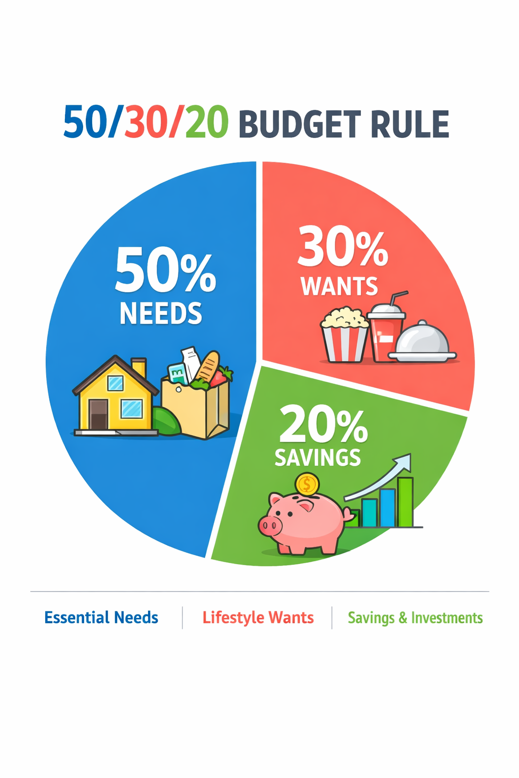 Wants30%Dining out, entertainment, hobbies, shopping, subscriptions, non-essential purchases