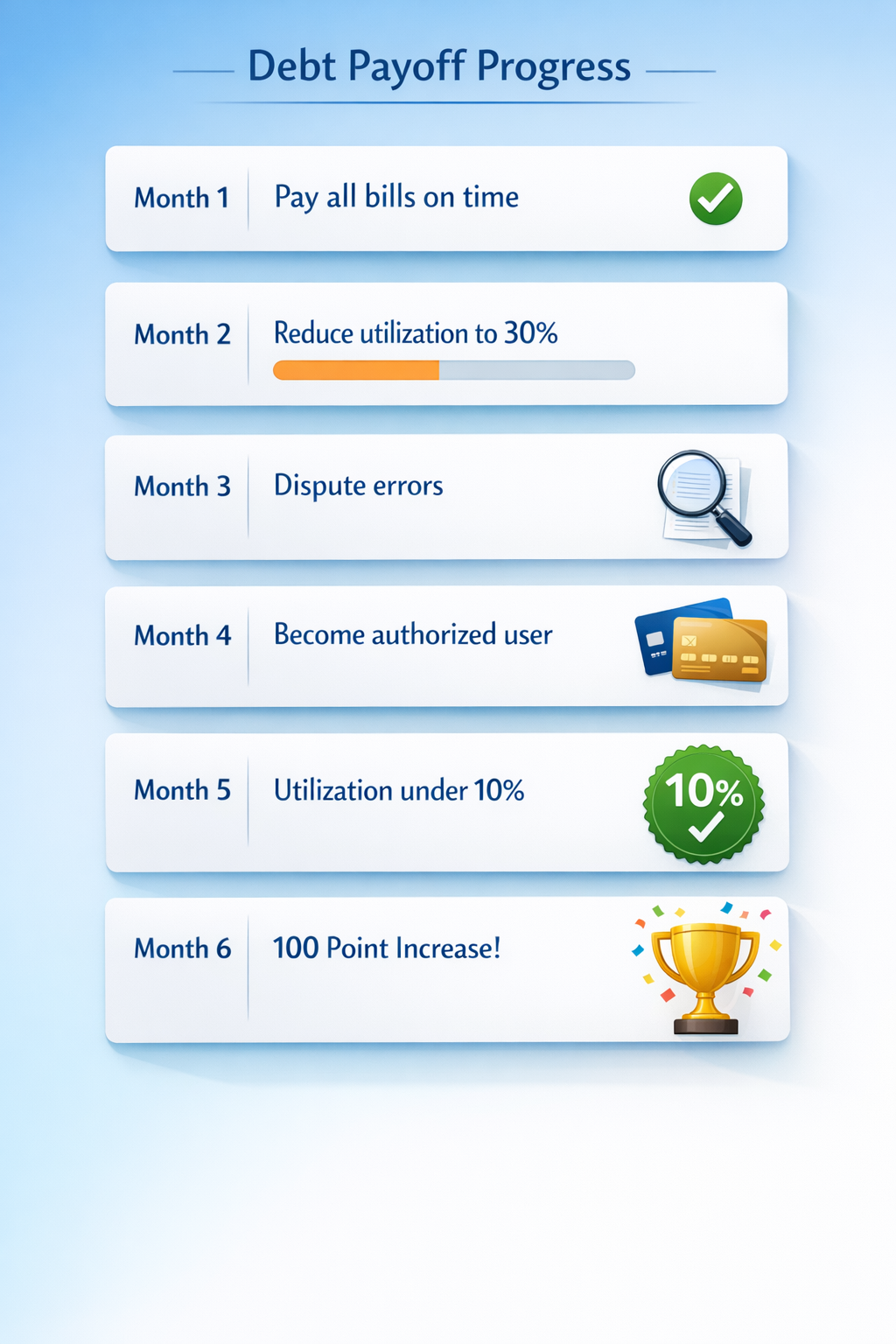 Most people can raise their credit score 100 points in 4-6 months by combining perfect payment history, reducing credit utilization below 30%, disputing errors, and adding positive payment data through authorized user status or Experian Boost. Those starting with very high utilization or recent errors may see faster results, while those with limited credit history may need closer to 6-9 months.