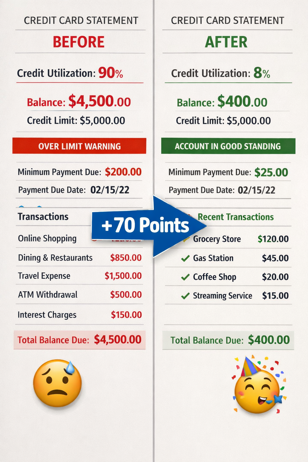 - Credit utilization is your quick win: Reducing credit card balances below 30% (ideally under 10%) of your limits can boost your score by 70+ points alone