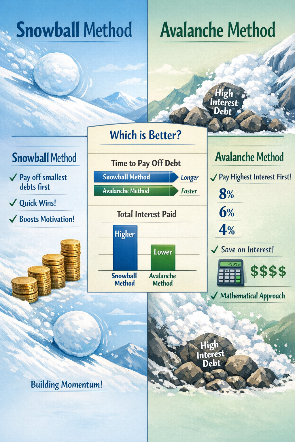 The debt snowball method pays off your smallest loan balance first regardless of interest rate, while the debt avalanche method targets your highest-interest loan first to minimize total interest paid. Both approaches work, but they appeal to different personality types and financial situations.