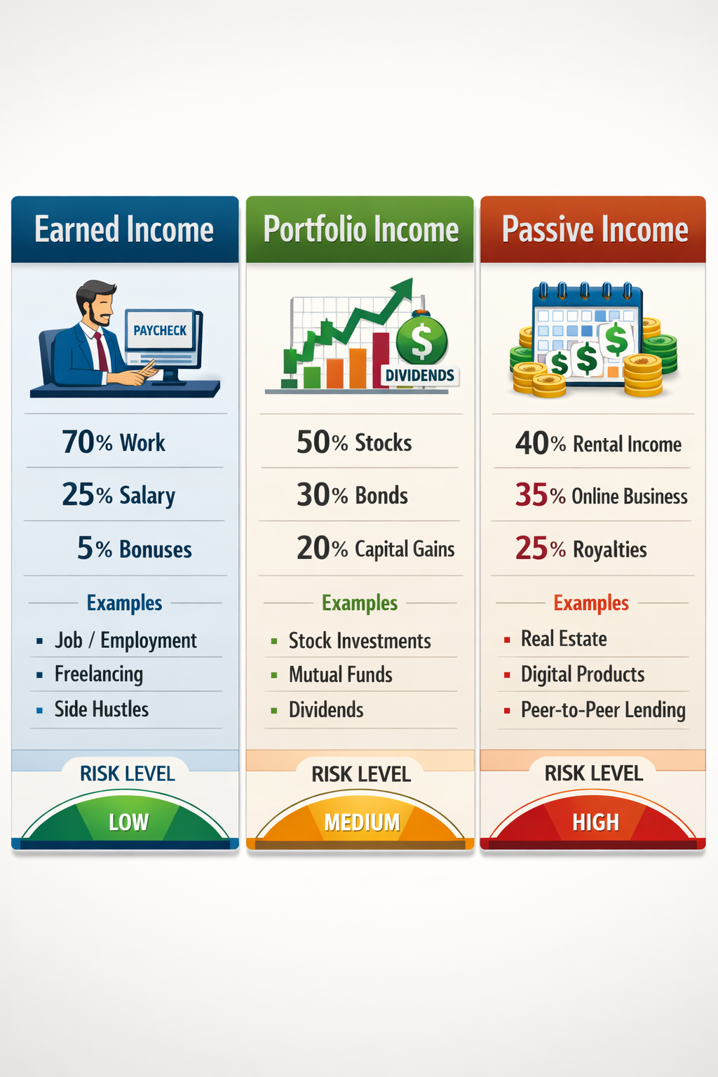 - Three main income categories exist: Earned income (active work), portfolio income (investments), and passive income (automated revenue) each serve different purposes in your wealth-building strategy