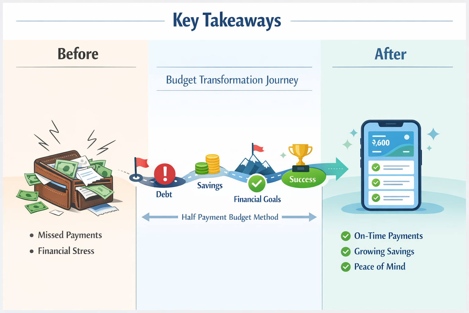 This method won’t magically increase your income or eliminate your expenses. What it will do is create clarity, reduce stress, and provide a stable foundation for achieving your financial goals. Whether you want to build an emergency fund, pay off debt, or simply stop living in financial anxiety, the Half Payment Budget Method can be the system that finally makes budgeting stick.