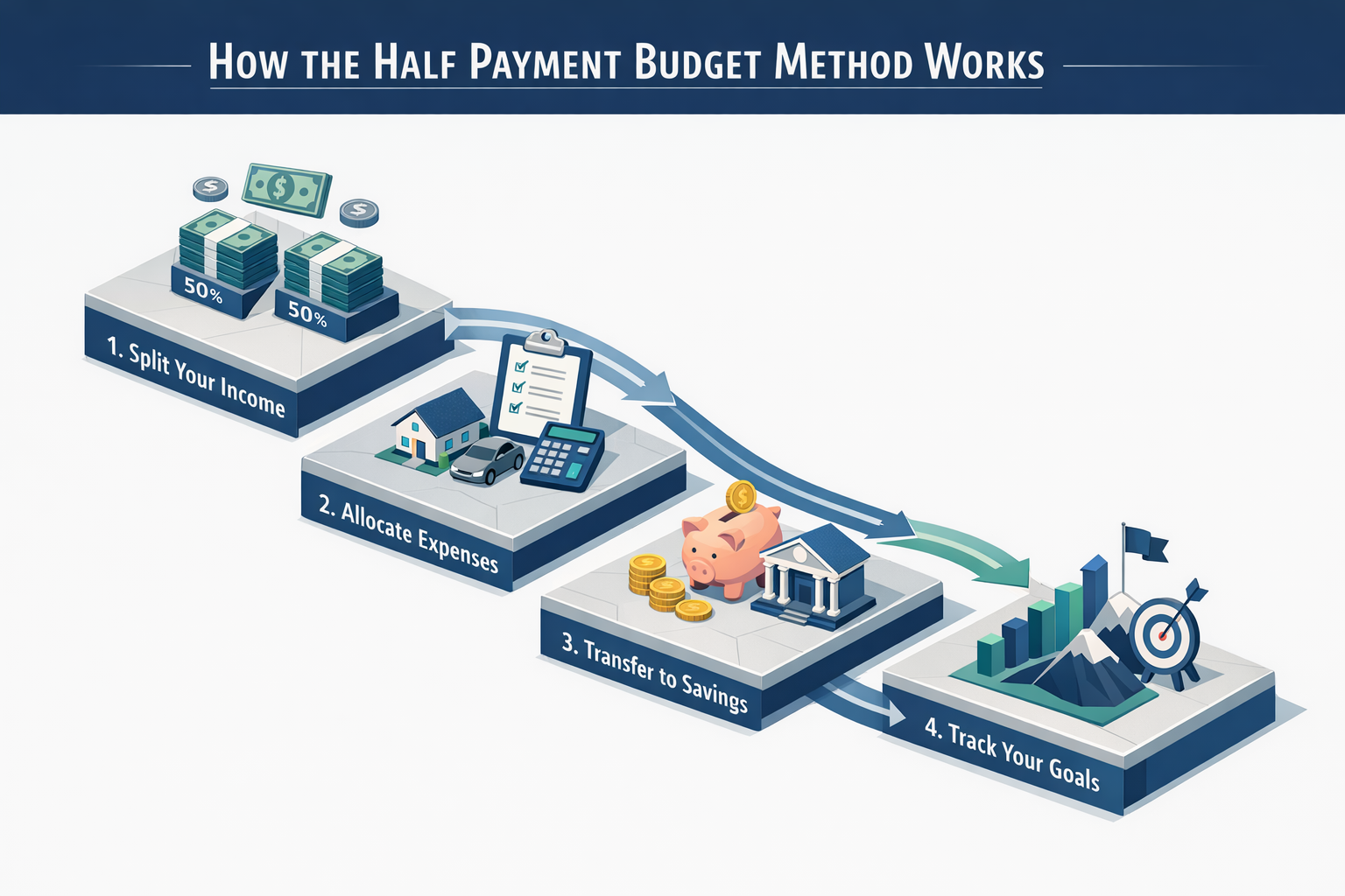 The Half Payment Budget Method is a budget cash flow strategy that divides your monthly expenses into two equal payments, each aligned with your paycheck schedule. Instead of paying your entire rent, utilities, and other bills from one paycheck while leaving the other for groceries and discretionary spending, you split everything down the middle.